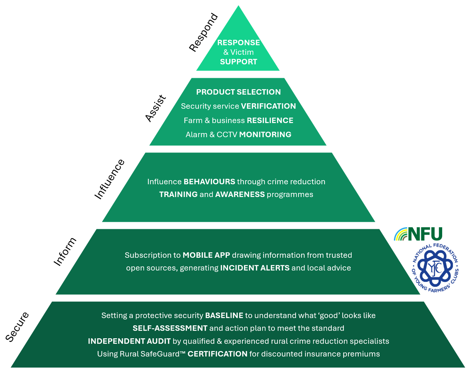 We review farm defences, share knowledge and training, verify security products and services, and offer post-incident support. Our programme consists of five levels – Secure, Inform, Influence, Assist, and Respond.